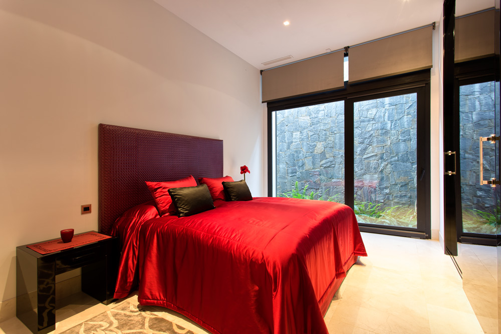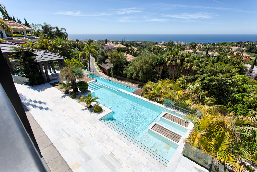 Overview: Top quality modern design, nicely situated on an elevated plot with spectacular sea views. Very quiet and private, still close to Marbella town and the beach. A driveway leads to the main entrance of the house. A grand hallway brings to the living and dining area and the fully fitted open plan kitchen. Direct access to the covered and open terraces, bbq and pool area with 3 different style pools (heated) all fit for outside living and relaxing. Upstairs a huge master bedroom en suite with dressing area, fitness and salon/bar and one guest bedroom en suite. Lower floors. Four bedrooms en suite, one fully fitted guest or staff apartment with two bedrooms and one bathroom, spa area with steam room, office, possible cinema room and garage for 4 to 5 cars. Fully fitted domotica system, B&O surround, under floor heating, A/C, elevator to all floors, outside parking. Gated community with 24hrs. security..
